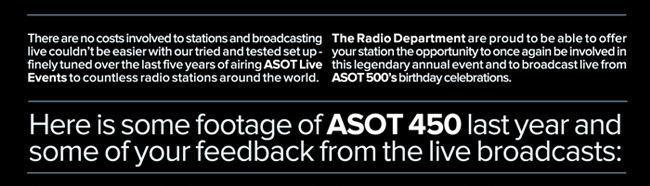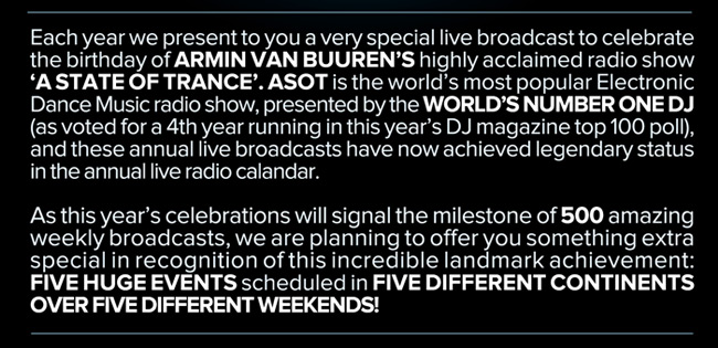 24 listopadu, během A State of Trance rádio - show, Armin van Buuren odhalí první jména na line-up Nizozemské oslavy A State of Trance 550. Která se koná v sobotu 31 březen 2012 v Brabanthallen v Den Boschkde se bude oslavovat 550-tou epizodu Armin van Buuren-ovo populárního rádio - show. Holanďská událost vzhlíží k tomu, být jednou z největších shows v kariéře světoznámých DJs.